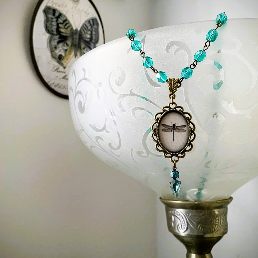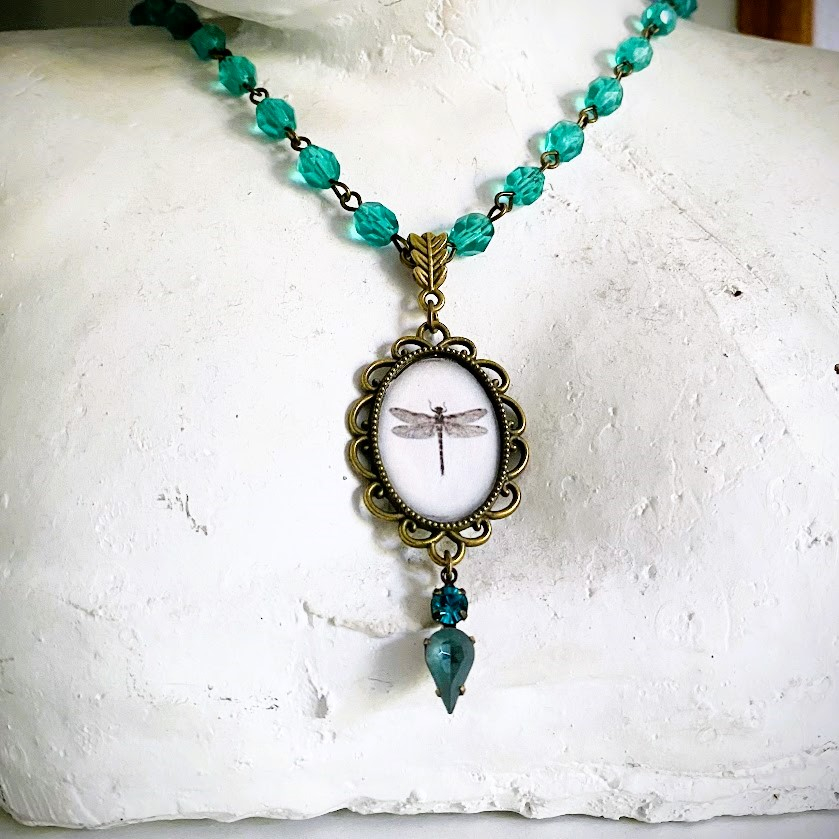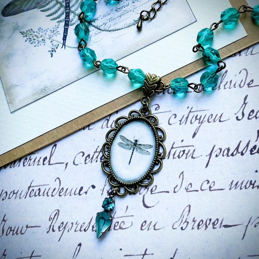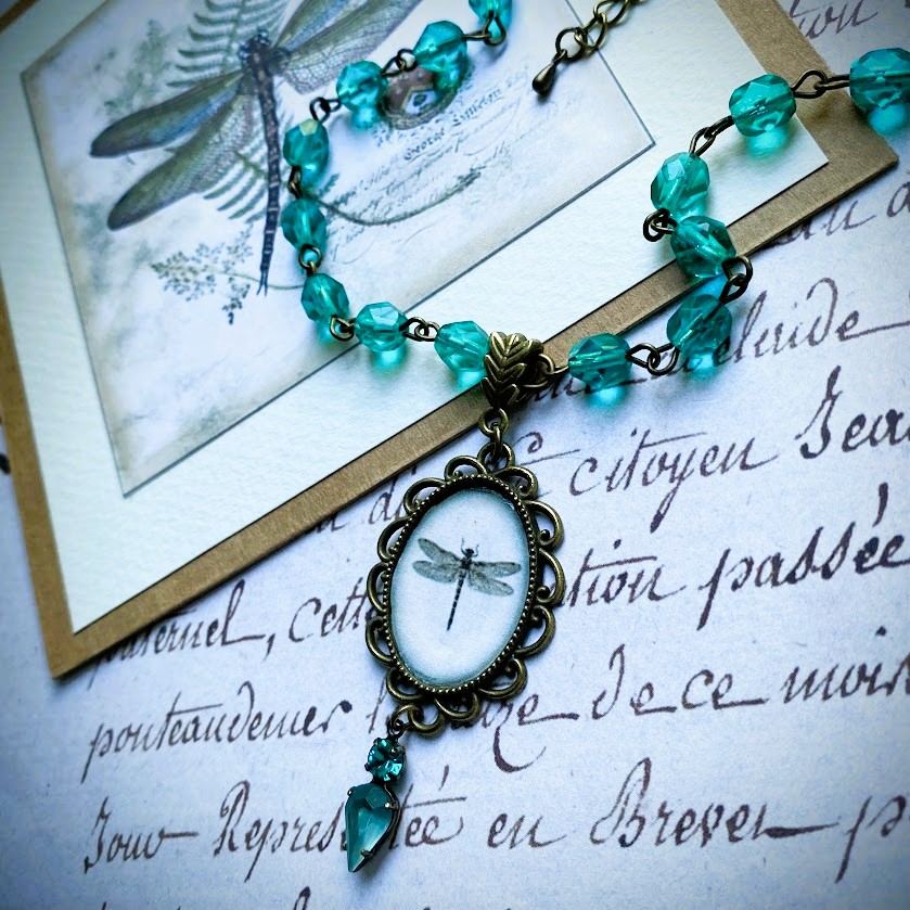 Libellula-kaulakorun lasihelmet ovat tsekkiläistä käsityötä. Niissä on pehmeä fasetointi ja ne taittavat valoa hienolla tavalla. Sudenkorentoaiheisessa riipuksessa on viehättävä, pitsimäinen kehys. Sen viimeistelee huurrelasilla ja kristallilla koristeltu detalji.
