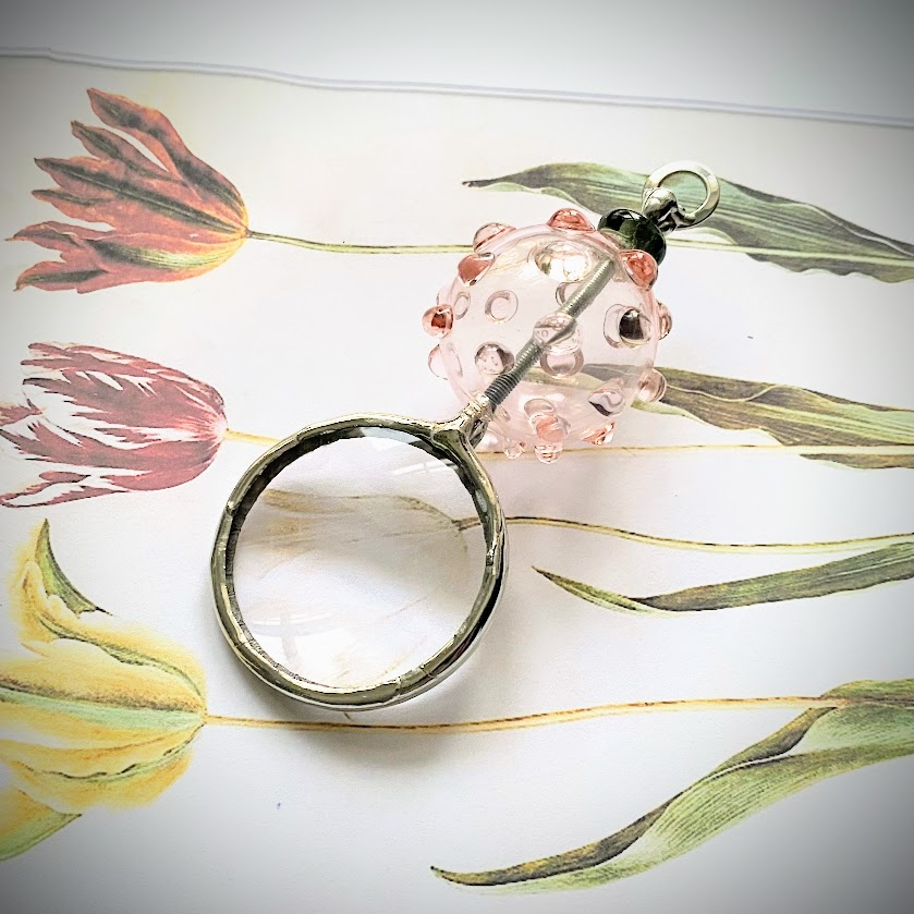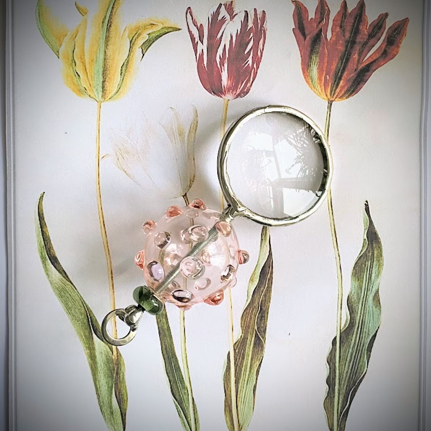 Tämä varrellinen suurennuslasi on tehty käsin Suomessa. Sen värikäs varsi on Muranon lasia (hämmästyttävän kestävää kovassakin käytössä). Suurennuslasin kehys on juotettu puhtaasta, lyijyttömästä korutinasta.