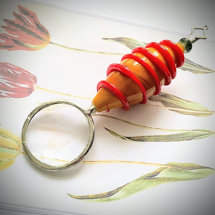 Tämä varrellinen suurennuslasi on tehty käsin Suomessa. Sen värikäs varsi on Muranon lasia (hämmästyttävän kestävää kovassakin käytössä). Suurennuslasin kehys on juotettu puhtaasta, lyijyttömästä korutinasta.