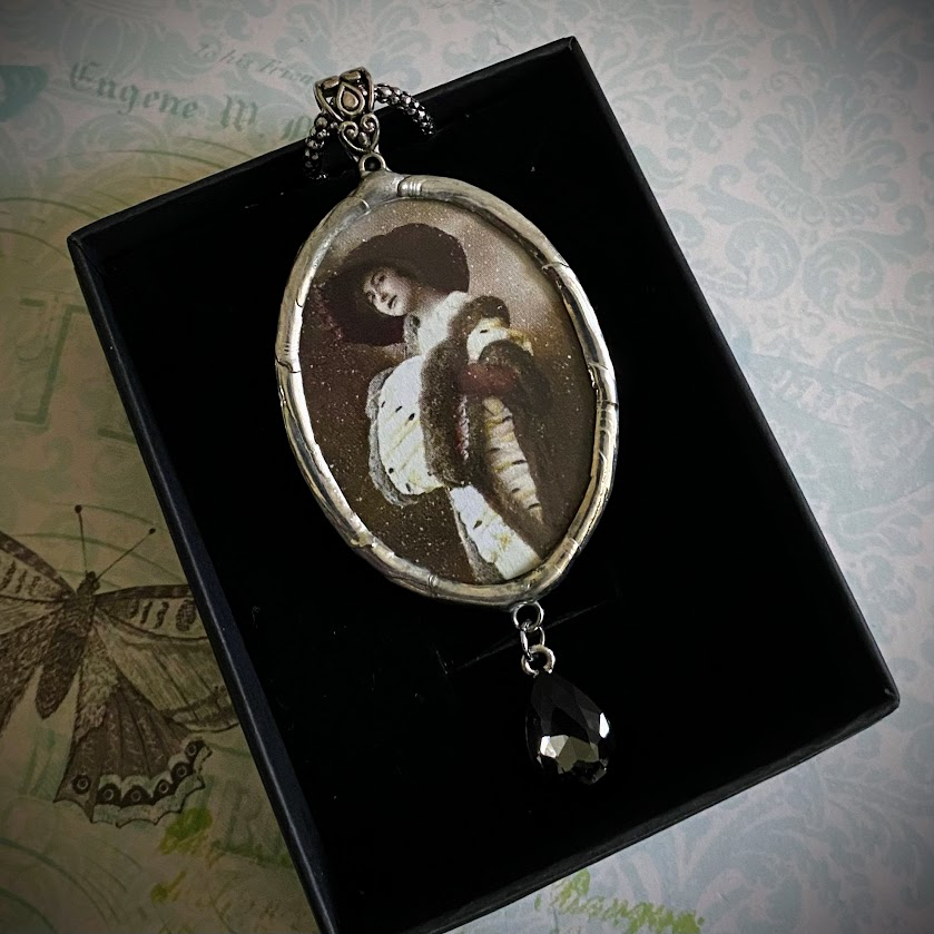 Tämä peilikoru on juotettu puhtaasta, lyijyttömästä korutinasta. Kuvapuolen takana peili. Ketjun pituus (n. 76cm) antaa sopivan liikkumavaran peilaamiseen: voit huomaamatta tarkistaa huulipunan tai kurkistaa, mitä olkasi takana tapahtuu.