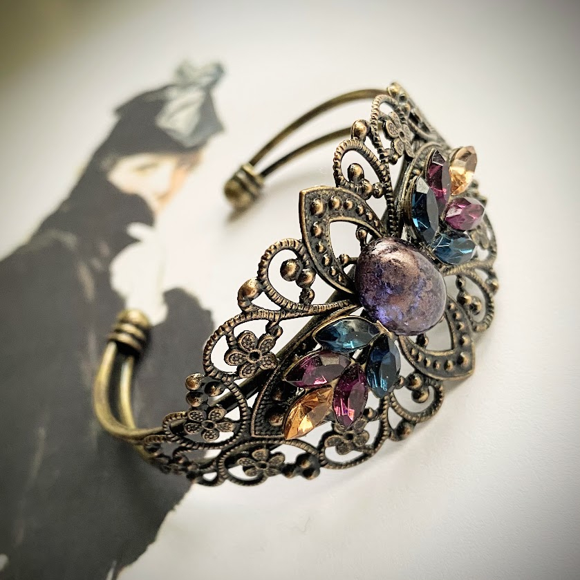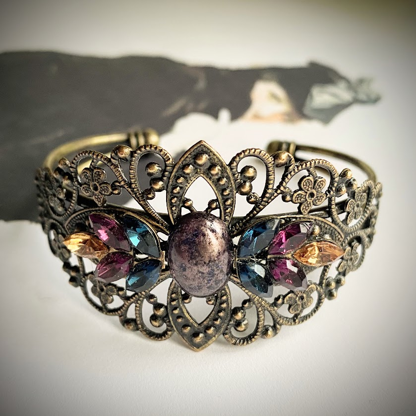 Tätä uniikkia, käsintehtyä rannekorua koristavat kauniit kristallit ja italialainen lusiitti.