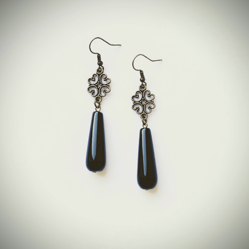 Sicilia IV -korvakorujen pitkä, kauniisti hiottu pisara on aitoa mustaa akaattia. Pisaraa kannattelee antiikkipronssinvärinen koristeosa.