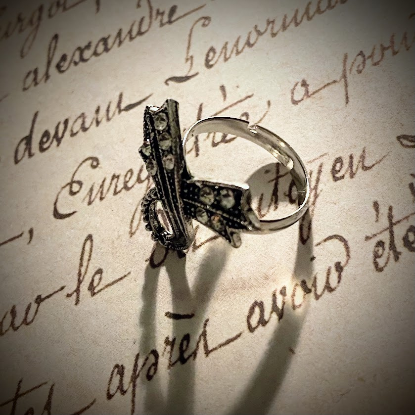 Tämä kauniisti muotoiltu sormus on koristettu kirkkailla, upotetuilla kristalleilla.