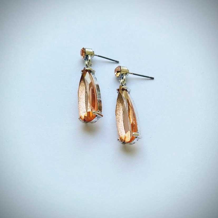 Hennon aprikoosinväriset, kristallihiotut korvakorut heijastelevat kauniisti valoa. Viehättävä pisarariipus liikkuu kauniisti.