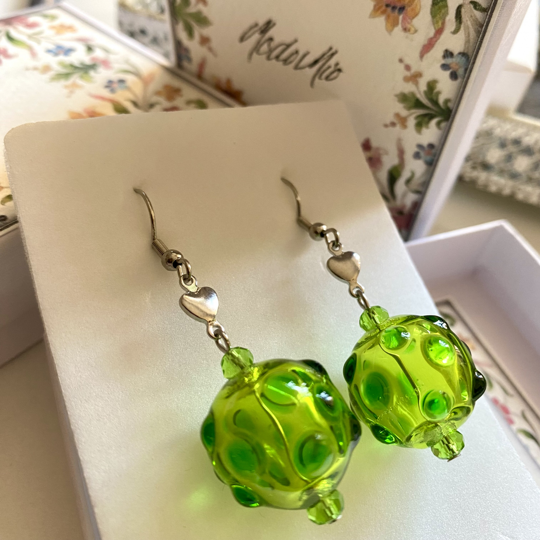 Murano-korvakorut on tehty korkealaatuisesta, kauniisti valoa taittavasta italialaisesta lasista. Nämä harvinaislaatuiset ontot lasihelmet tehdään puhaltamalla pitkään puhallusputkeen ja työstämällä lasi haluttuun muotoon ennen lasimassan jähmettymistä.
