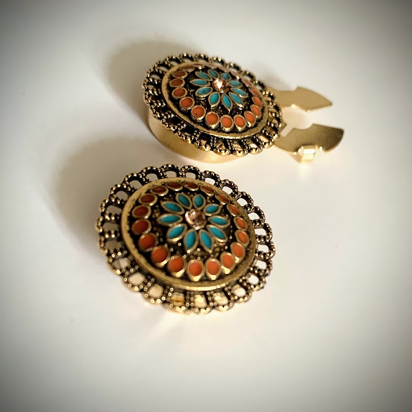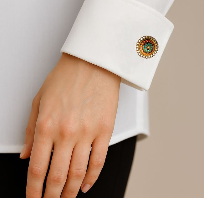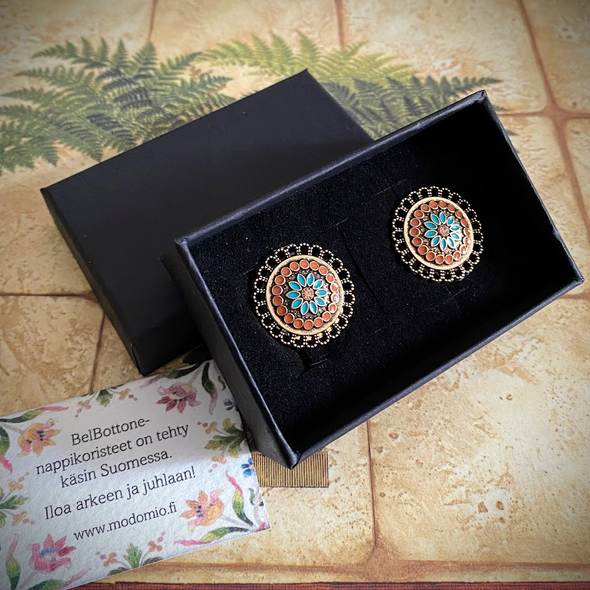 Nämä emaloidut, antiikkikullanväriset nappikorut antavat hetkessä asullesi persoonallisen, viimeistellyn ilmeen.