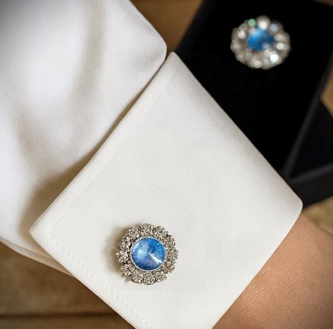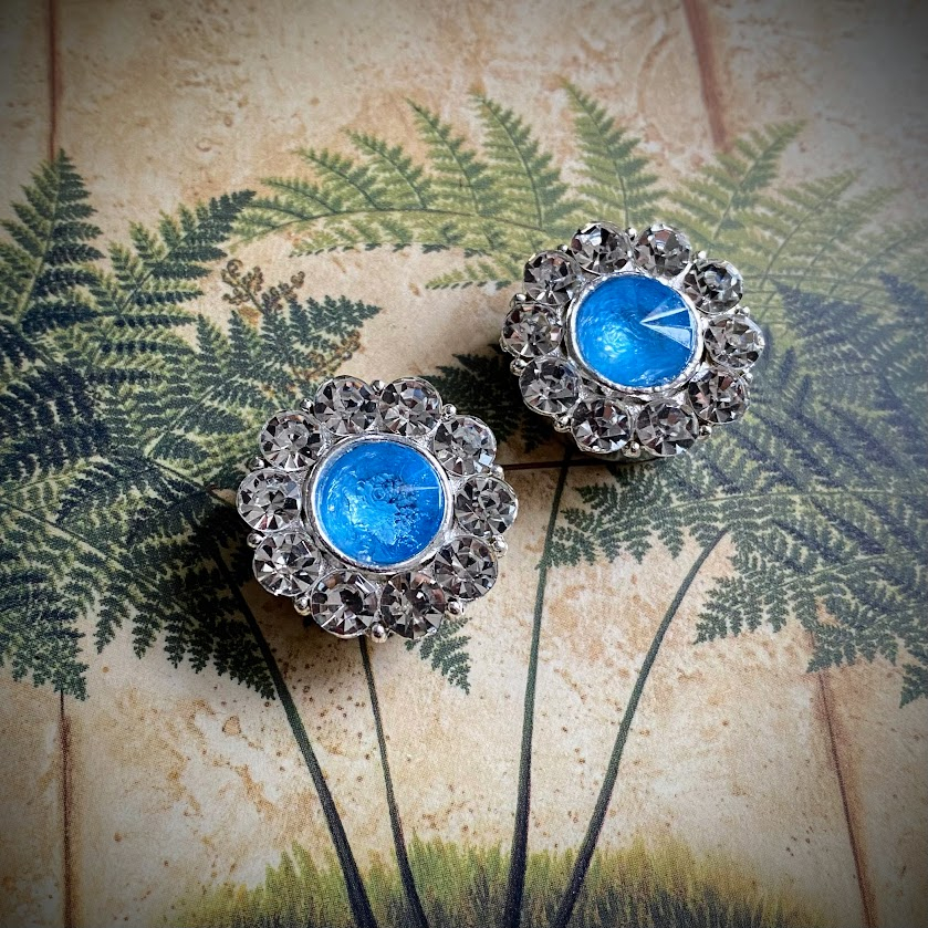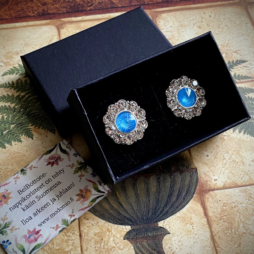 Nämä taivaansinisellä lasilla ja pienillä kristalleilla viimeistellyt nappikorut antavat hetkessä asullesi persoonallisen, viimeistellyn ilmeen.