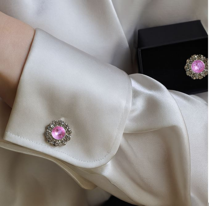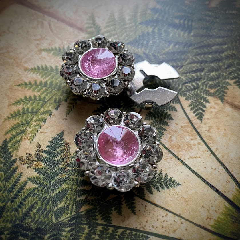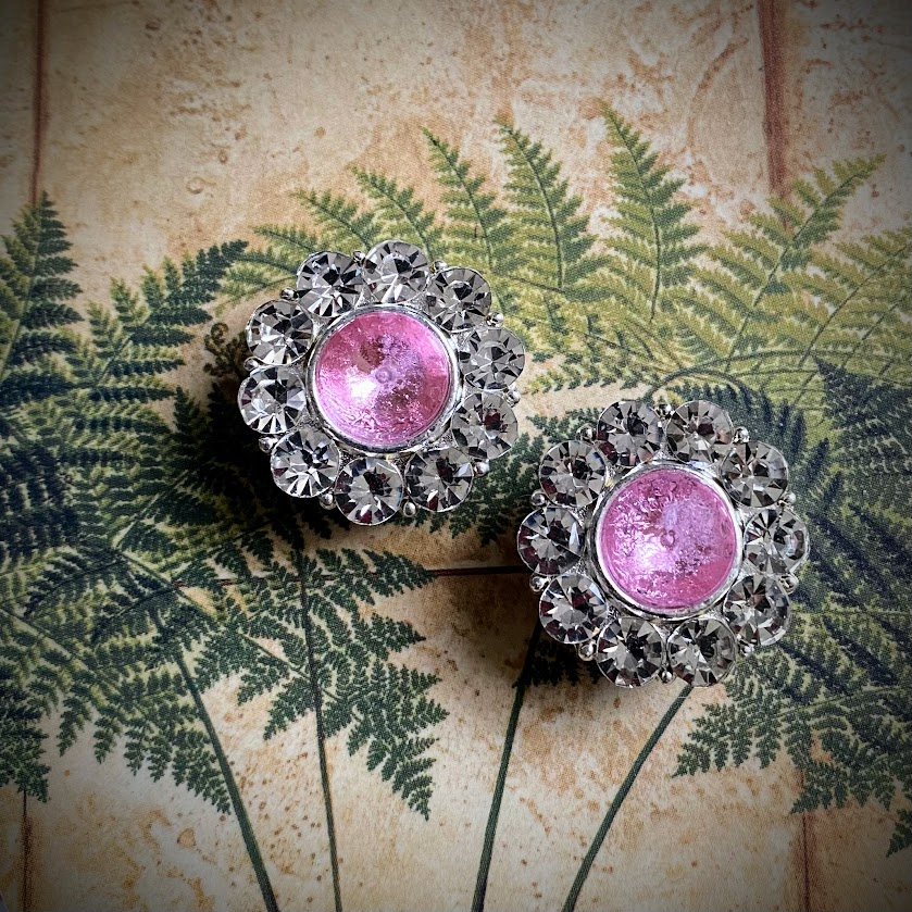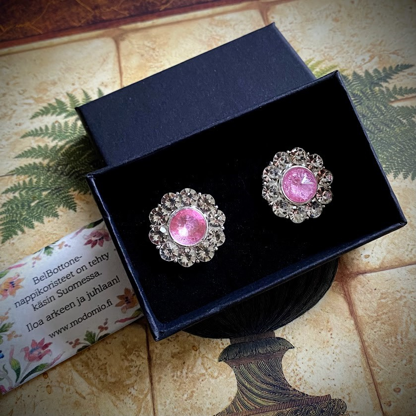 Nämä ruusunpunaisella lasilla ja pienillä kristalleilla viimeistellyt nappikorut antavat hetkessä asullesi persoonallisen, viimeistellyn ilmeen.