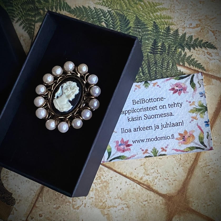 Tätä nappikorua koristaa aito vintageriipus (peräisin 50-luvulta). Kaunis kameekoru on kehystetty kullatulla, käsinpunotulla helmikehyksellä. Nappikoru antaa hetkessä asullesi persoonallisen, viimeistellyn ilmeen.