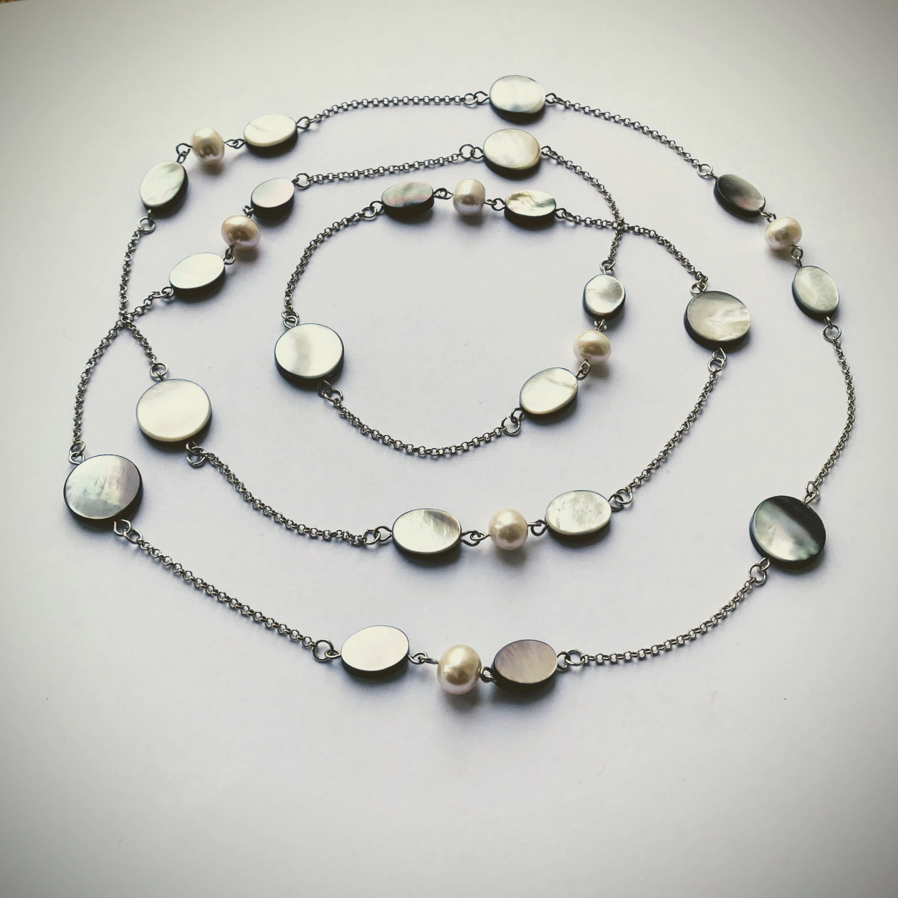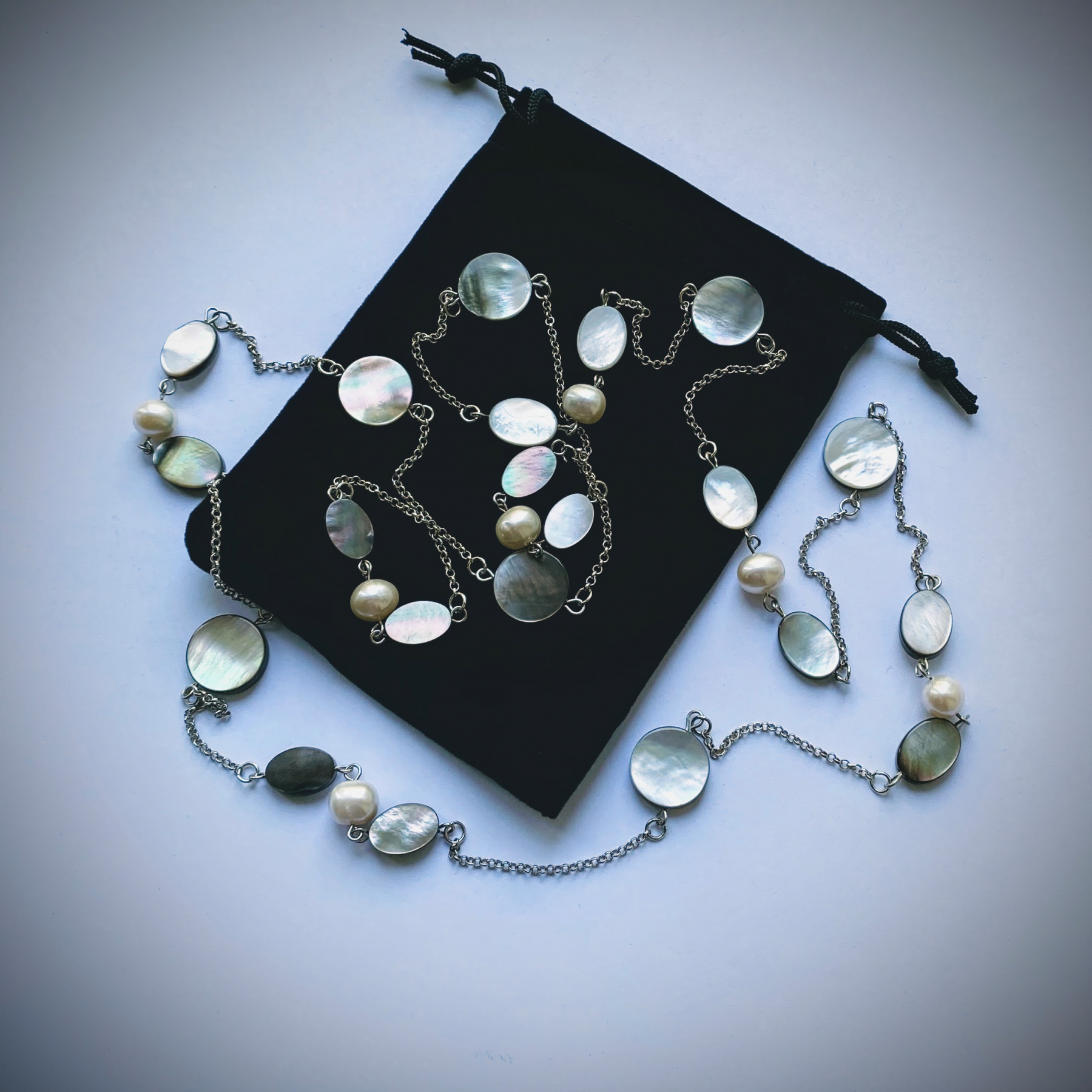 Kevyt ja selkeälinjainen, hienostuneesti hohteleva Laguna Pearl II -kaulakoru on tehty Tahitin mustan simpukan helmiäisestä ja aidoista makeanveden helmistä. Koru on käsintehty Suomessa. Se on helppo yhdistää erivärisiin asuihin, ja sitä voi käyttää sekä pitkänä että kaksinkerroin.