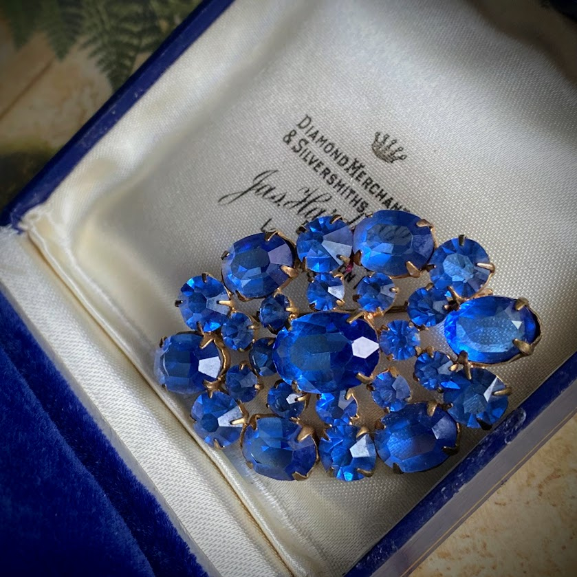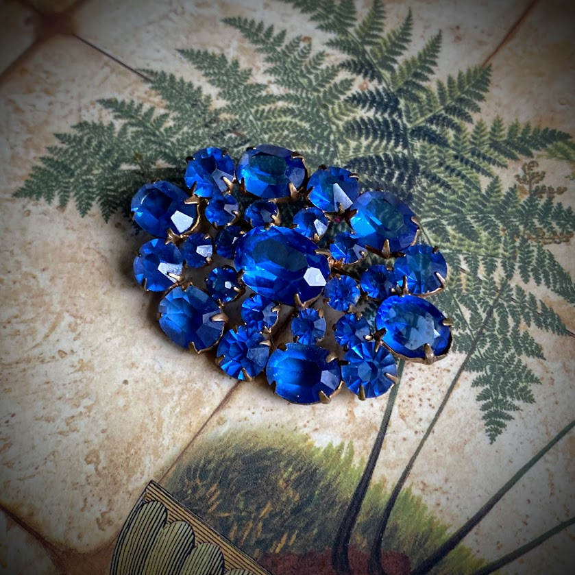 Tämä viehättävä rintakoru on peräisin 1950-luvulta. Valo leikittelee kauniisti sinisissä, taitavasti hiotuissa detaljeissa.