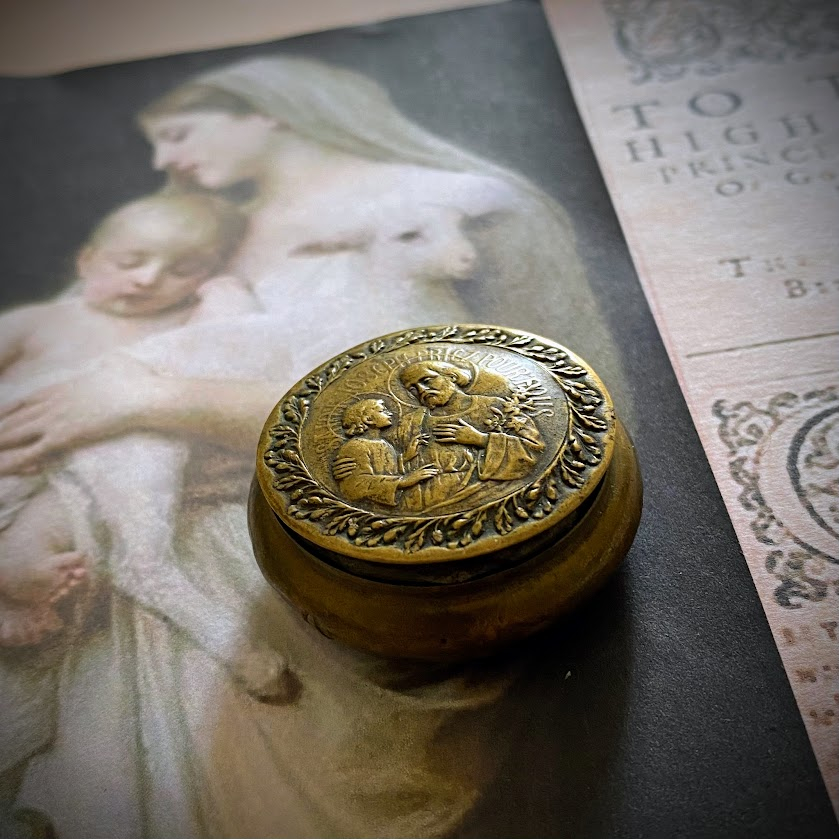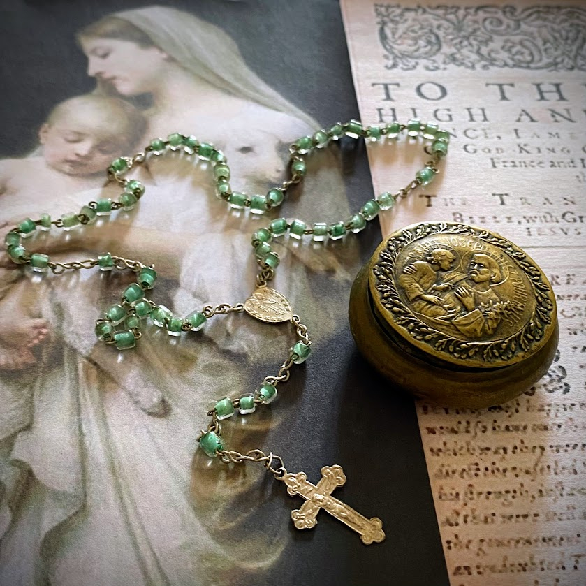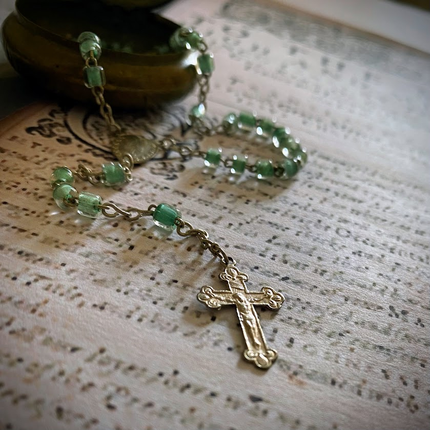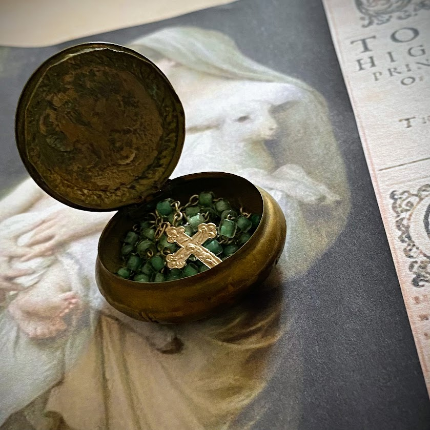 Tämä ranskalainen, käsintehty rukousnauha rasioineen on peräisin 1900-luvun alulla Lourdesiin suuntautuneelta pyhiinvaellusmatkalta. Rukousnauhan kunto on yli sadan vuoden iän huomioiden erittäin hyvä, samoin sen sisäänsä sulkeva rasia. Vihreäsävyiset helmet ovat käsintehtyä lasia, risti hopeanvärinen, rasia messinkiä.