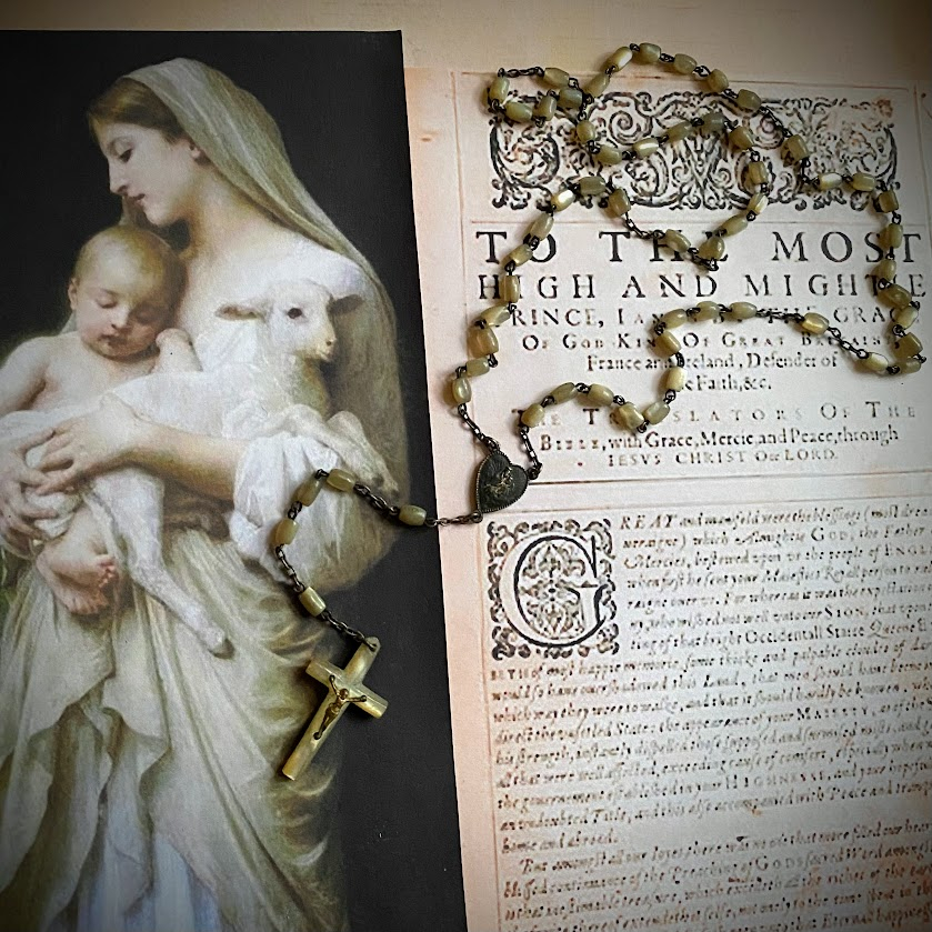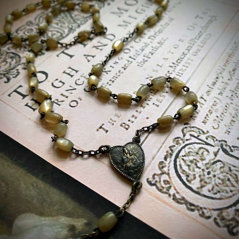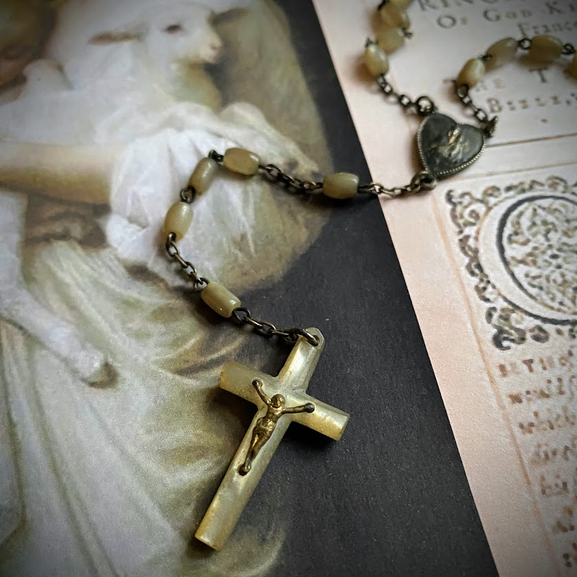 Tämä ranskalainen, käsintehty rukousnauha on peräisin 1900-luvun alulla Lourdesiin suuntautuneelta pyhiinvaellusmatkalta. Rukousnauhan kunto on yli sadan vuoden iän huomioiden erittäin hyvä. Helmet ovat aitoa helmiäistä, risti samoin.