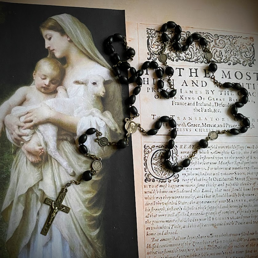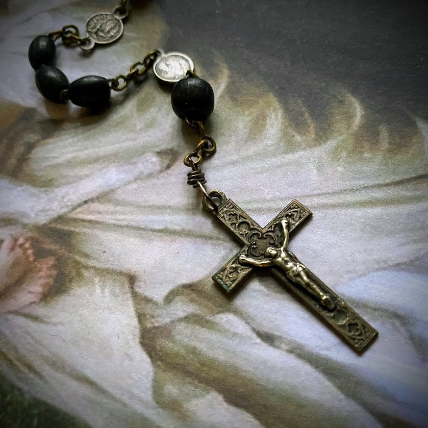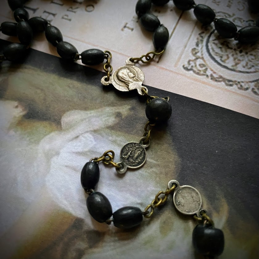 Tämä ranskalainen, käsintehty rukousnauha on peräisin 1900-luvun alulla Lourdesiin suuntautuneelta pyhiinvaellusmatkalta. Rukousnauhan kunto on yli sadan vuoden iän huomioiden erittäin hyvä. Helmet ovat tummaa puuta, risti antiikkihopeanvärinen.