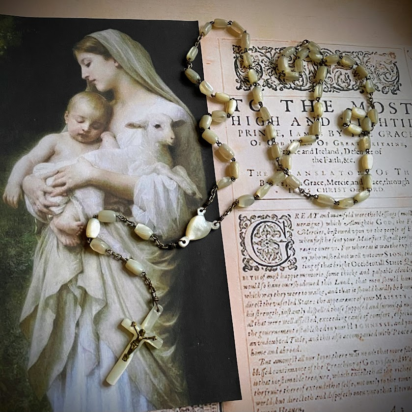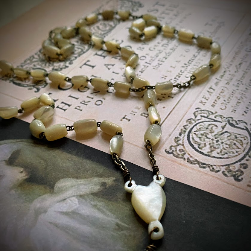 Tämä ranskalainen, käsintehty rukousnauha on peräisin 1900-luvun alulla Lourdesiin suuntautuneelta pyhiinvaellusmatkalta. Rukousnauhan kunto on yli sadan vuoden iän huomioiden erittäin hyvä. Helmet ovat aitoa helmiäistä, risti samoin.