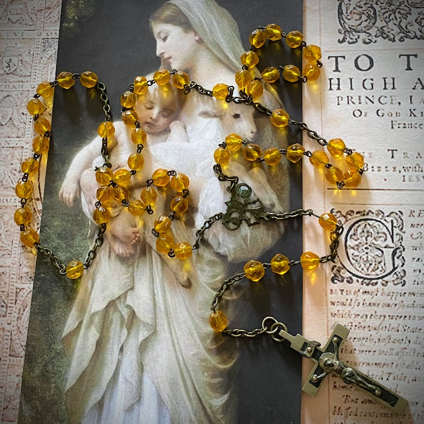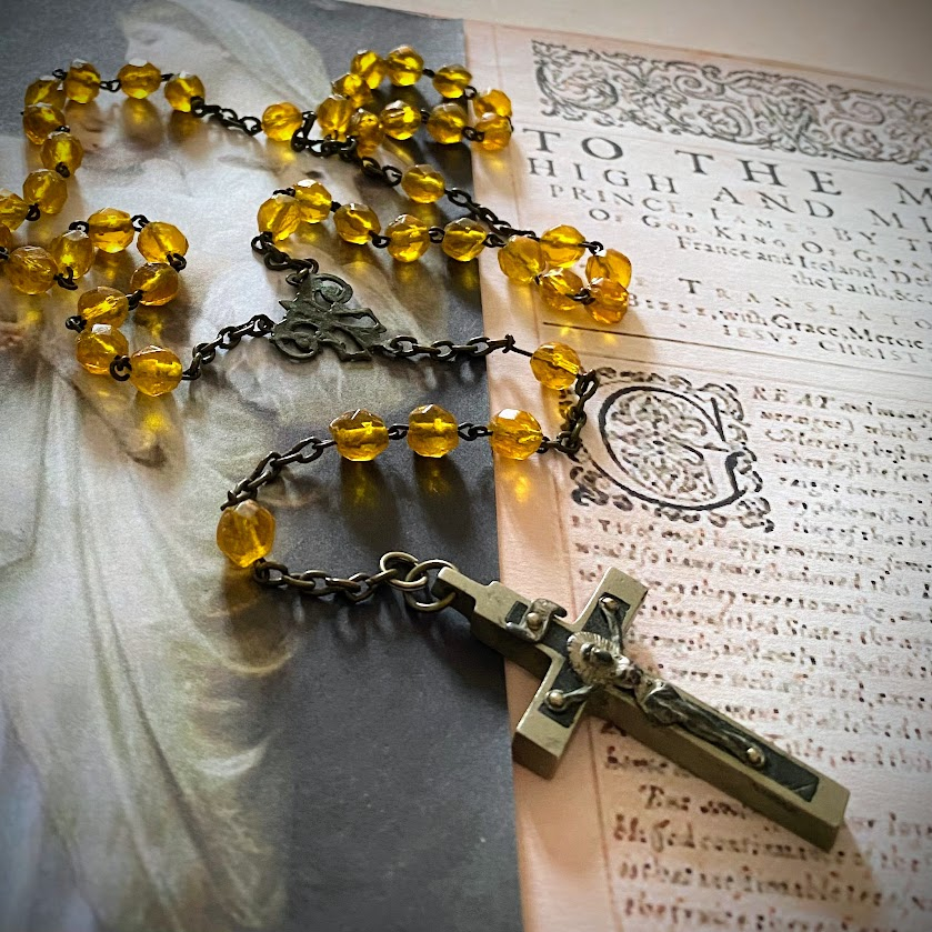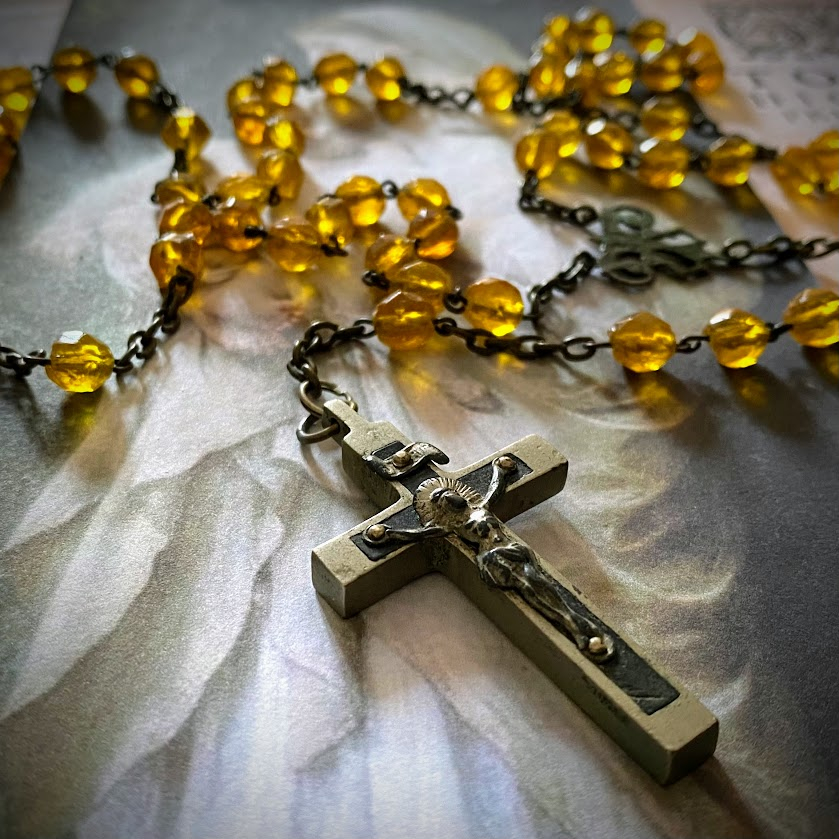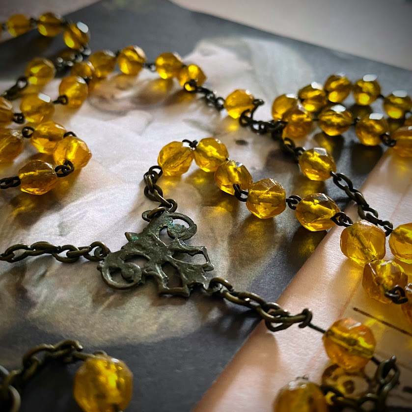 Tämä ranskalainen, käsintehty rukousnauha on peräisin 1900-luvun alulla Lourdesiin suuntautuneelta pyhiinvaellusmatkalta. Rukousnauhan kunto on yli sadan vuoden iän huomioiden erittäin hyvä. Helmet ovat topaasinväristä lasia, risti antiikkihopeanvärinen/musta.