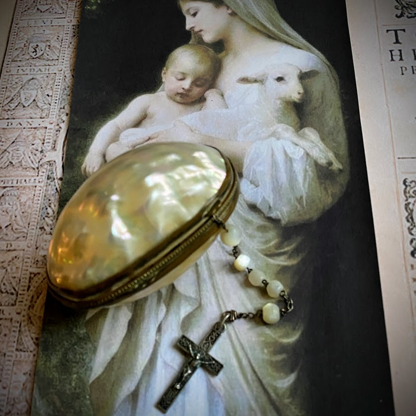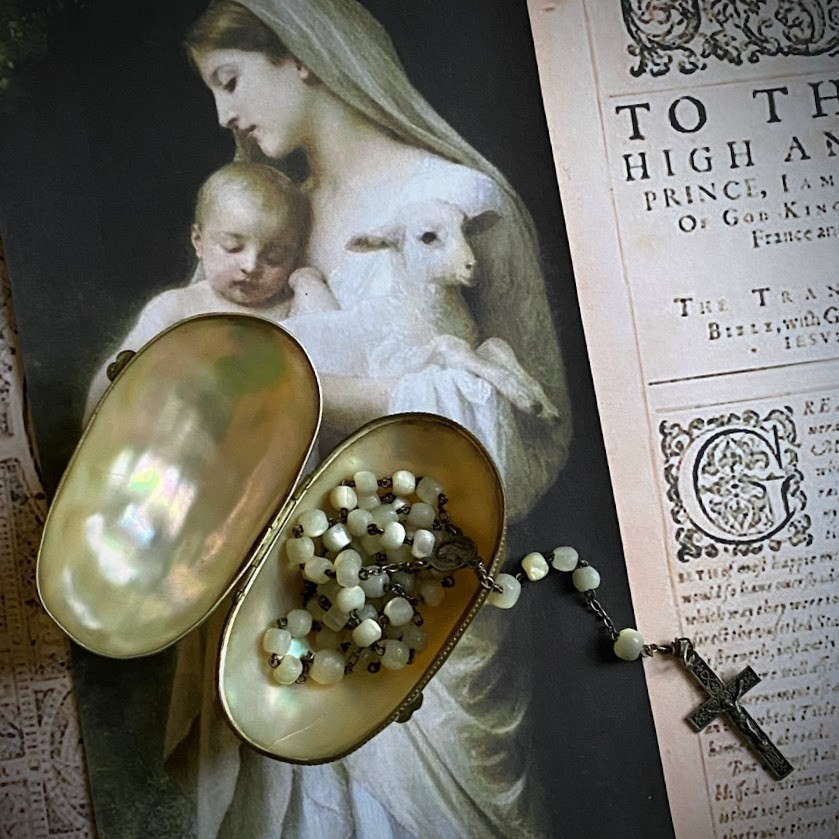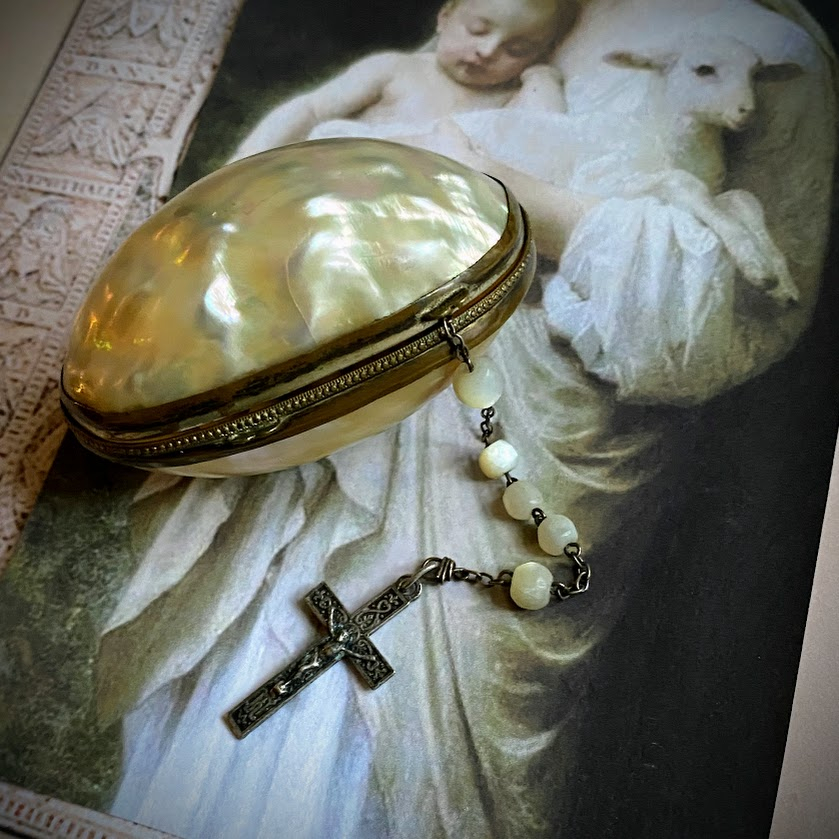 Tämä aidosta helmiäisestä taidokkaasti tehty rukousnauharasia on peräisin 1900-luvun alkuvuosilta. Rasian kunto on yli sadan vuoden iän huomioiden erittäin hyvä ja mekanismi toimii moitteettomasti.