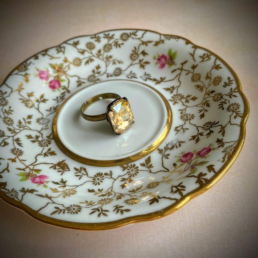 Kauniisti hiottu, shampanjanvärinen lasisuorakulmio on upotettu antiikkipronssinväriseen kehykseen.