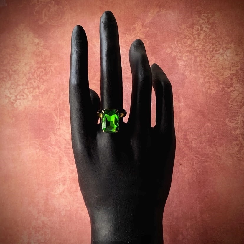 Kauniisti hiottu, ruohonvihreä lasisuorakulmio on upotettu antiikkipronssinväriseen kehykseen.