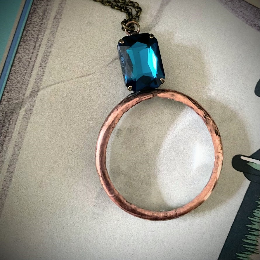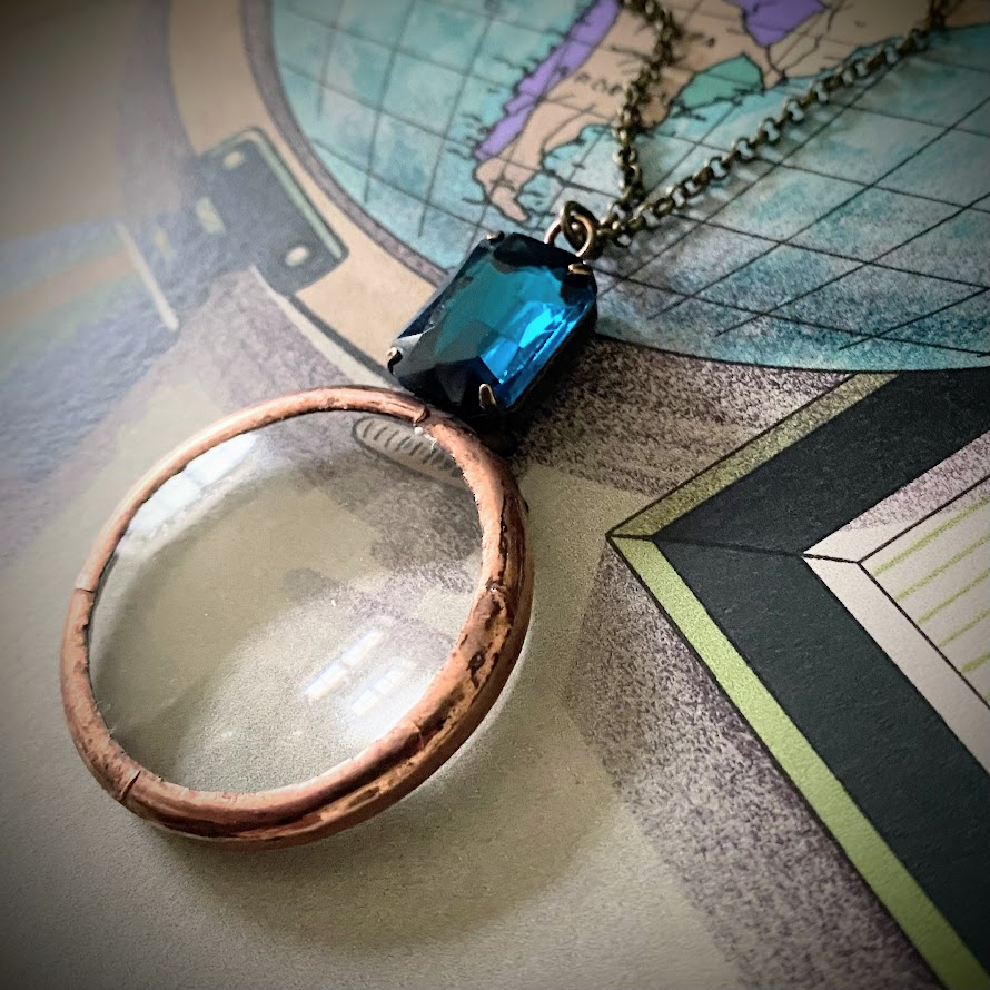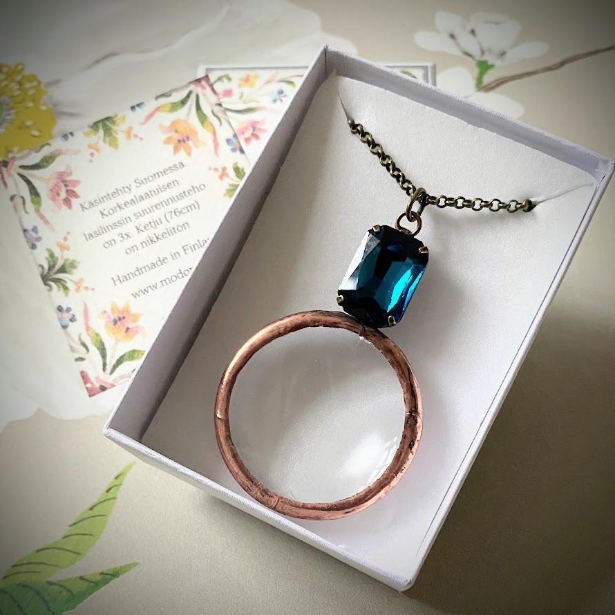 Patinoitu Alexandra-suurennuslasikoru on tehty käsin Suomessa korkealaatuisista materiaaleista. Sitä koristaa kauniisti hiottu turkoosi lasidetalji, joka on upotettu antiikkiprossinväriseen kehykseen. Optinen lasilinssi pysyy kirkkaana ja naarmuttomana kovassakin käytössä. Tyylikäs koru on käytännöllinen ja kaunis apu, kun teksti on oikein pientä.