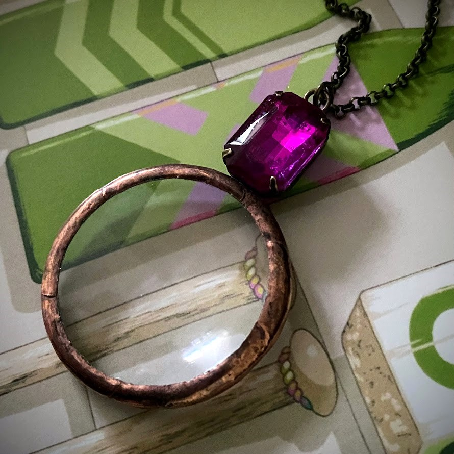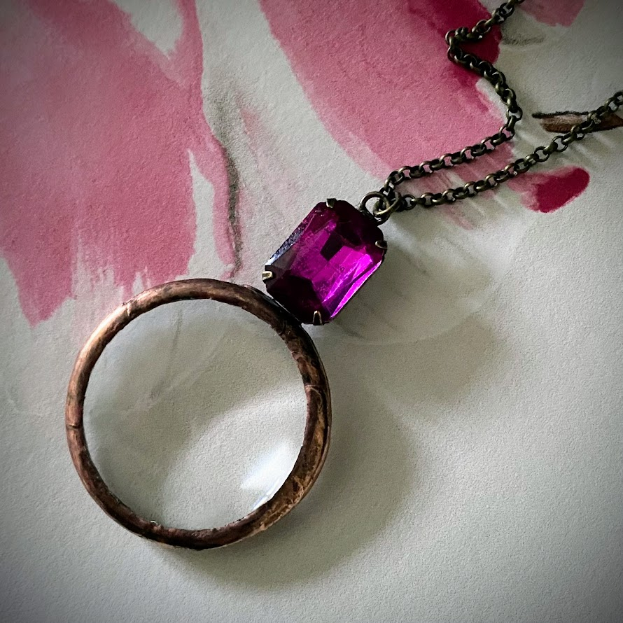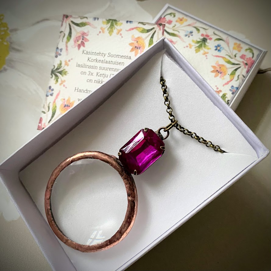Patinoitu Alexandra-suurennuslasikoru on tehty käsin Suomessa korkealaatuisista materiaaleista. Sitä koristaa kauniisti hiottu fuksianvärinen lasidetalji, joka on upotettu antiikkiprossinväriseen kehykseen. Optinen lasilinssi pysyy kirkkaana ja naarmuttomana kovassakin käytössä. Tyylikäs koru on käytännöllinen ja kaunis apu, kun teksti on oikein pientä.