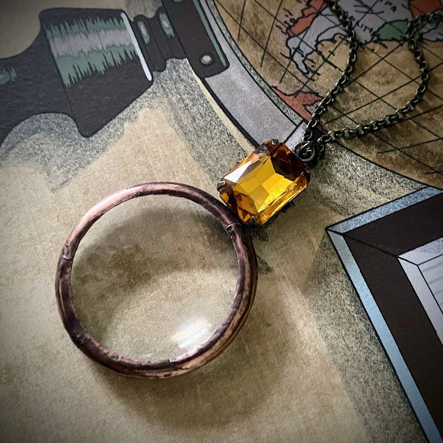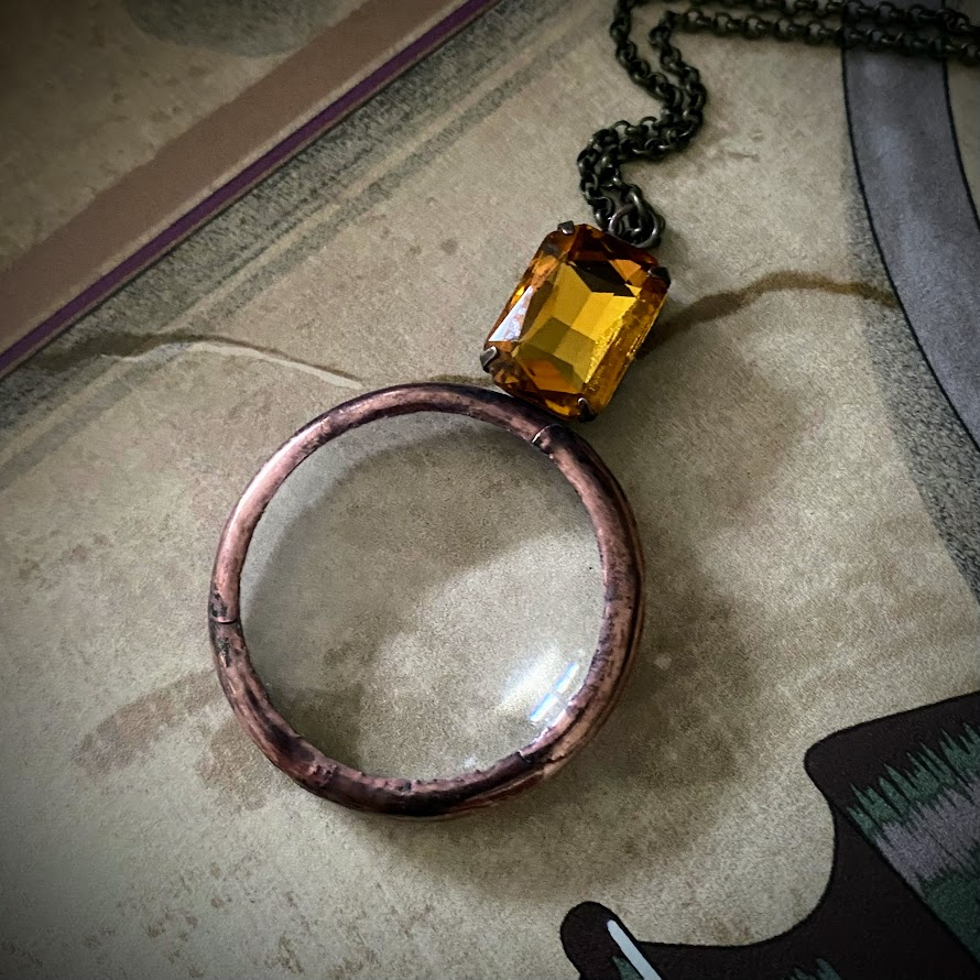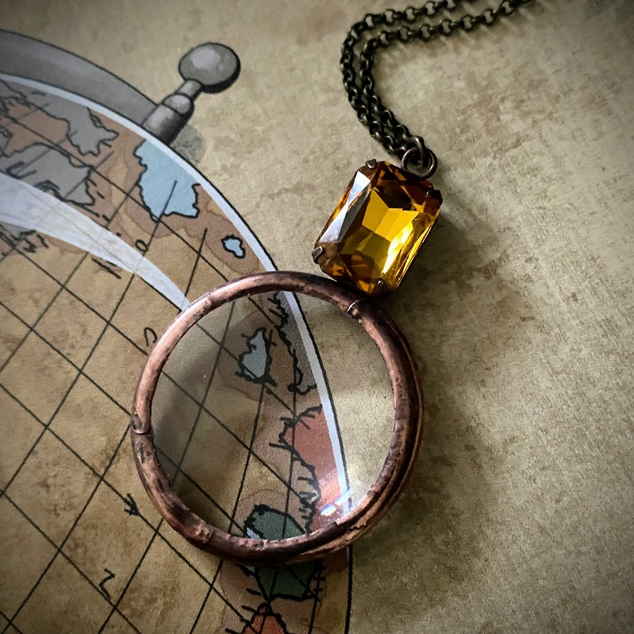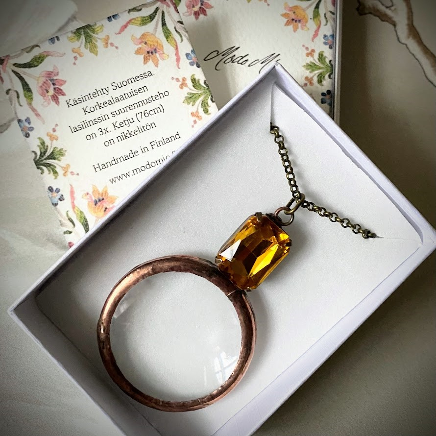 Patinoitu Alexandra-suurennuslasikoru on tehty käsin Suomessa korkealaatuisista materiaaleista. Sitä koristaa kauniisti hiottu auringonkukankeltainen lasidetalji, joka on upotettu antiikkiprossinväriseen kehykseen. Optinen lasilinssi pysyy kirkkaana ja naarmuttomana kovassakin käytössä. Tyylikäs koru on käytännöllinen ja kaunis apu, kun teksti on oikein pientä.