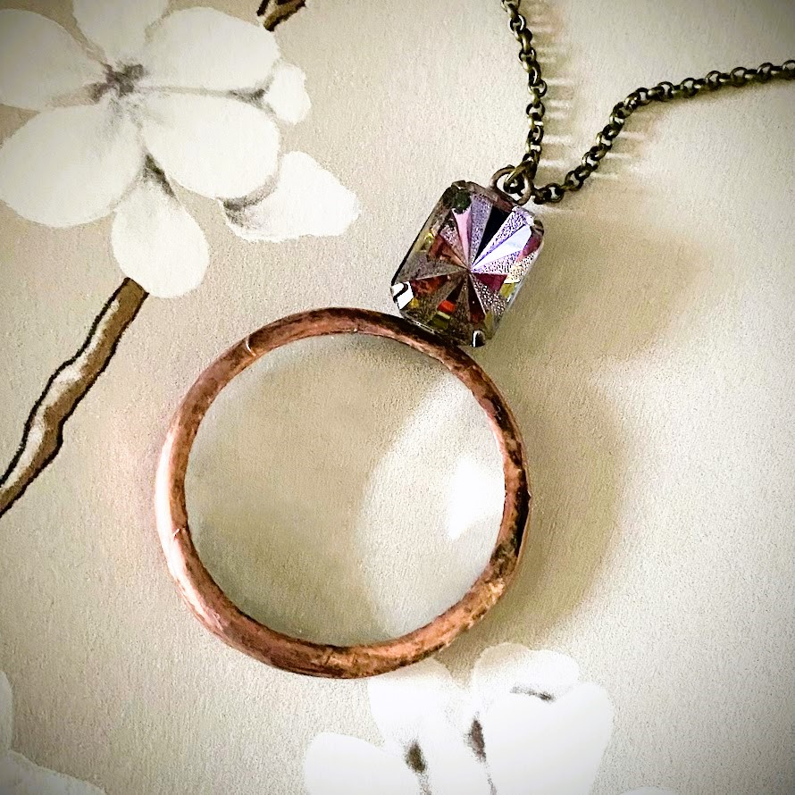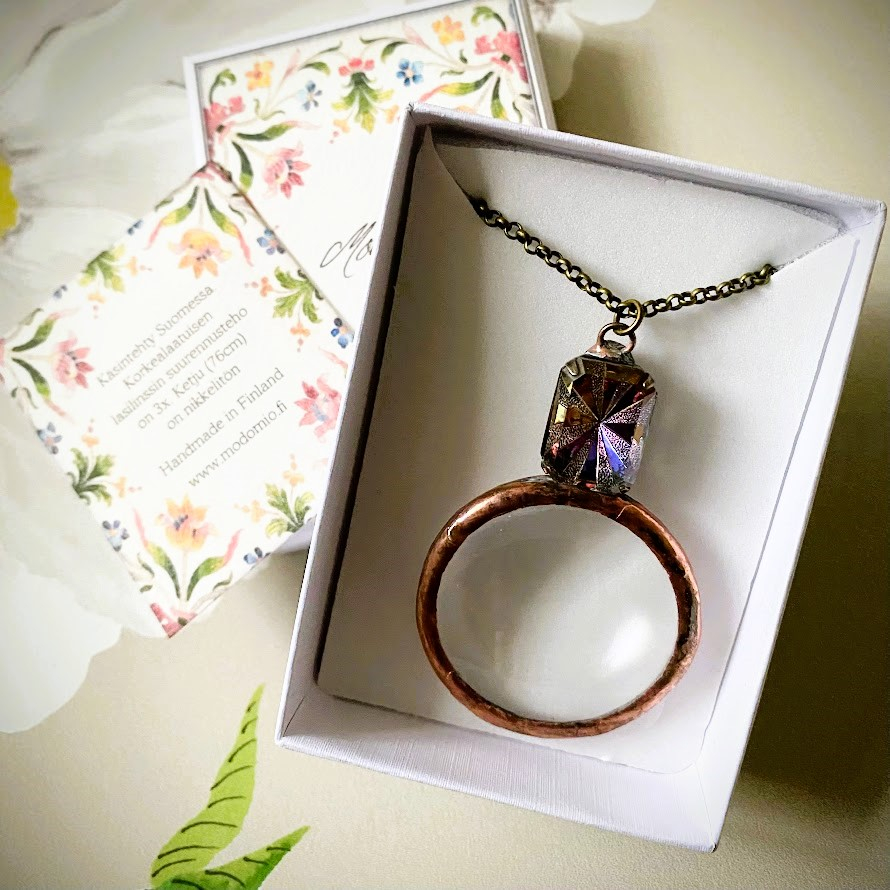 Patinoitu Alexandra-suurennuslasikoru on tehty käsin Suomessa korkealaatuisista materiaaleista. Sitä koristaa kauniisti hiottu lasidetalji, joka on upotettu antiikkiprossinväriseen kehykseen. Optinen lasilinssi pysyy kirkkaana ja naarmuttomana kovassakin käytössä. Tyylikäs koru on käytännöllinen ja kaunis apu, kun teksti on oikein pientä.