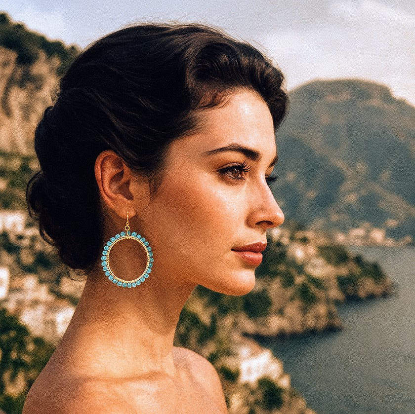 Amalfi IV -korvakorut on tehty aidosta, kauniisti hiotusta kalsedonista. Metalliosissa on 18 karaatin kultaus. Selkeälinjaiset, keveät korvakorut liikkuvat naisellisesti,