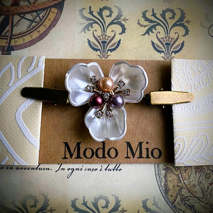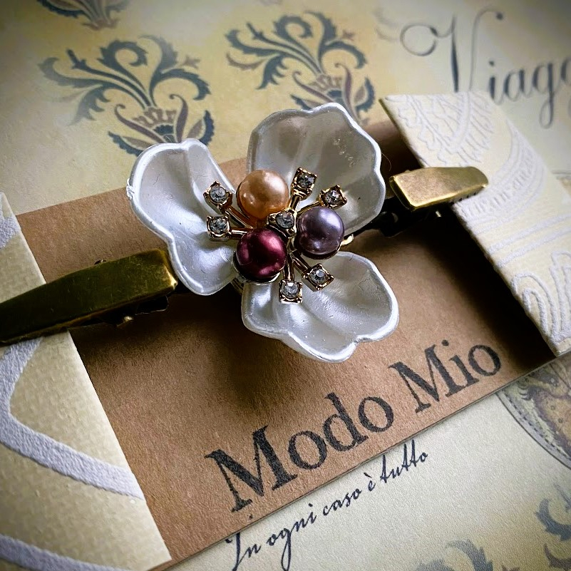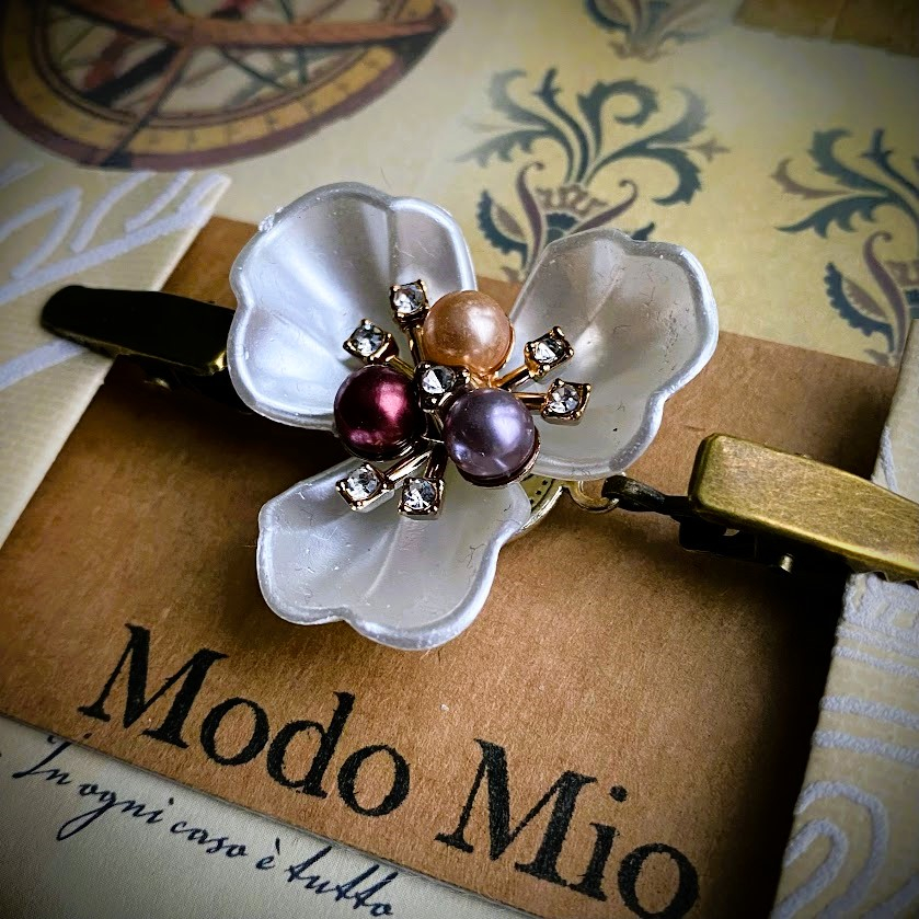 Tämä klipsi on koristeltu kauniilla, helmenhohtoisella kukalla, joka puolestaan on viimeistelty värikkäillä helmillä ja pikkuisilla kristalleilla.