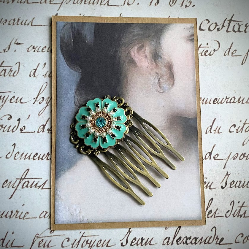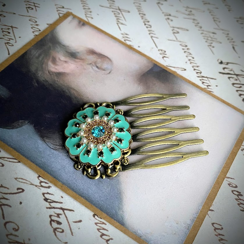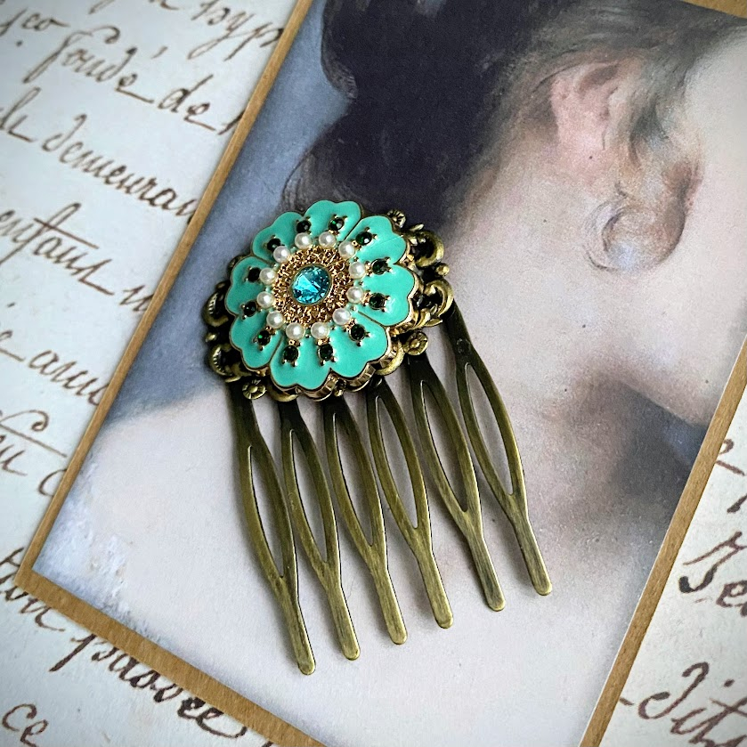 Antiikkimessinginväristä kampaa koristaa upea, turkoosisävyinen detalji. Emaloitu kukka on viimeistelty helmillä ja kristalleilla.