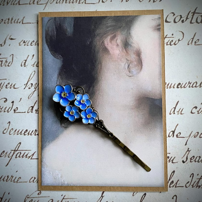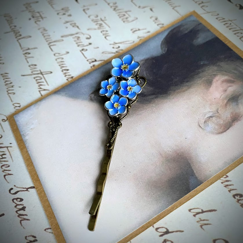 Antiikkipronssinväristä hiuspinniä koristavat kauniit, emaloidut lemmikit.