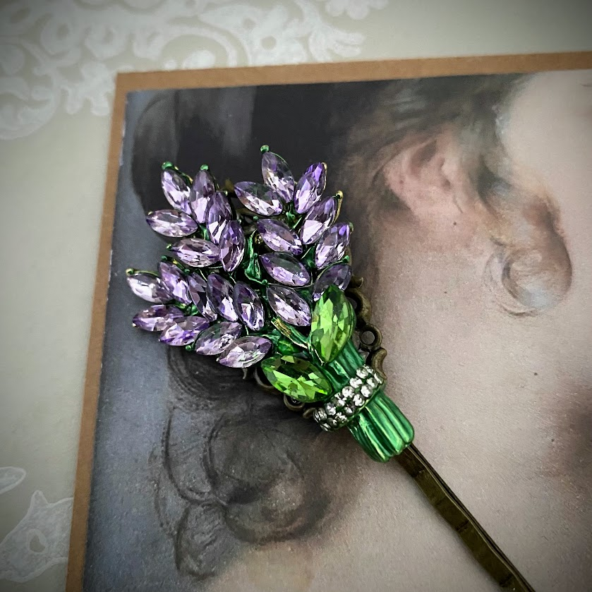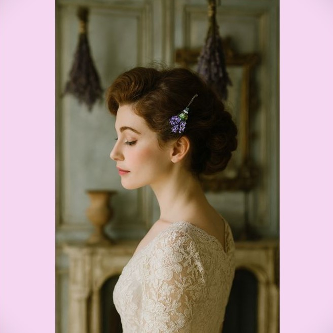 Kauniilla laventelikimpulla varustettu hiuskoriste.